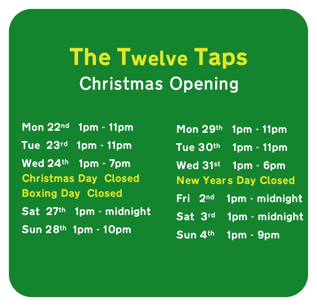 The Twelve Taps is an inclusive space and any racism, sexism, homophobia, transphobia, or ableism will not be tolerated. Anyone found to be making other customers or staff feel uncomfortable will be asked to leave.
